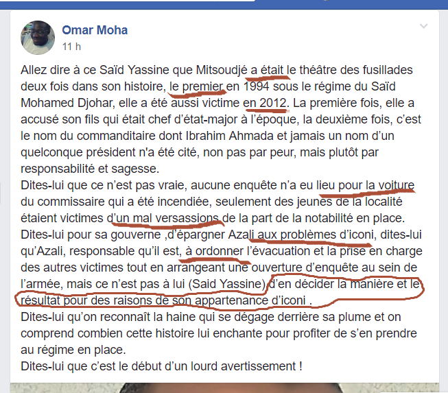 Si cette jolie plume tienne, mon frère de sang S/C Omar Moha, échappe à ta signature, auteur de ces idées, ce n’est pas pour rien. En tout cas, toi comme tant d’autres qui transformez la morosité encaissée par un grand nombre de la population, morosité à la politique du chef de l’Etat, dosée de mépris au peuple et de l’anarchie constitutionnelle, en haine à l’homme, je ne suis pas responsable de ce que vous ressentez. J’assume ma position et preuve est que je ne suis même pas parmi ceux qui regrettent d’avoir contribué à la victoire d’ Azali même si « ngaridjo hurehemu hudjadji ». La raison, je te dirai, si tu la demandes… et je la dirai à qui veut la connaitre. Donc, mon frère tu devrais savoir, que tu ne peux rien ni me faire ni me dire… quoi que ce soit, face à face et n’en parlons plus dans ta cavale d’encre. Une chose tu dois savoir : mon défaut et le même que celui du président de mon pays : la rancune donc tu risques d’être victime.